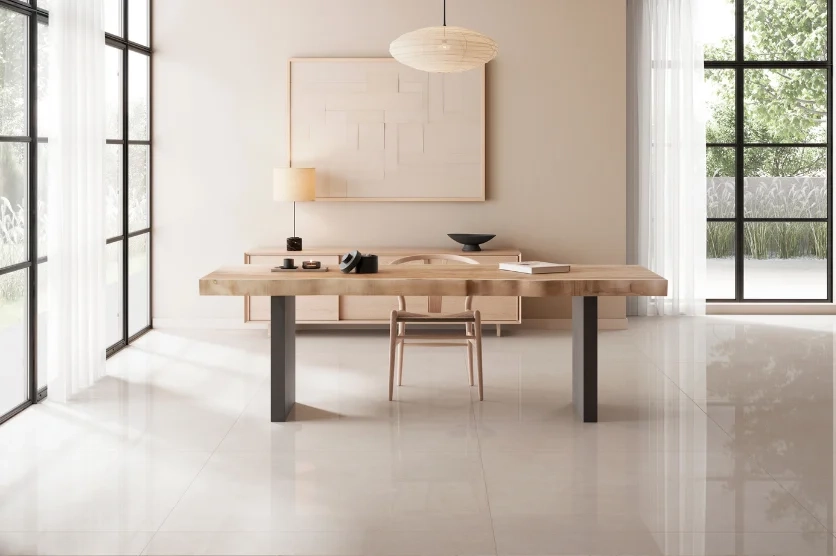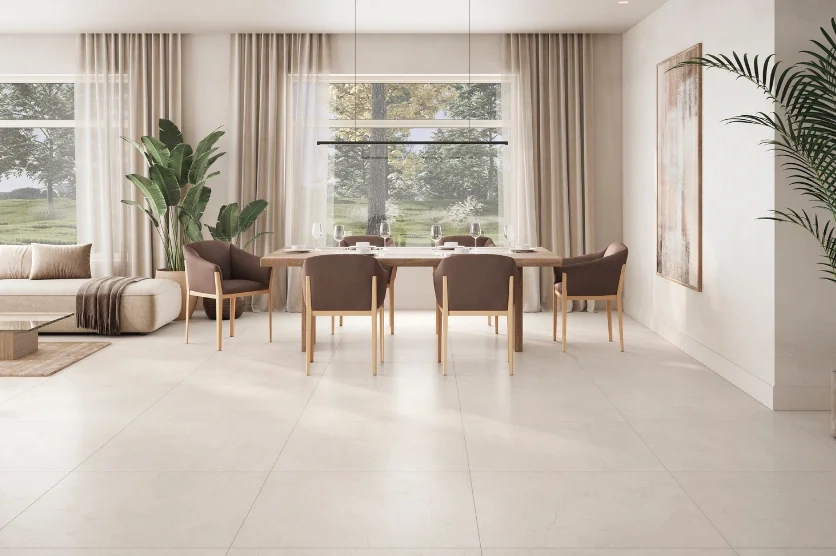 Albor, un carrelage effet pierre pour un intérieur contemporain et épuré. Son format 90x90 cm offre une impression d'espace et minimise les joints, créant une surface harmonieuse